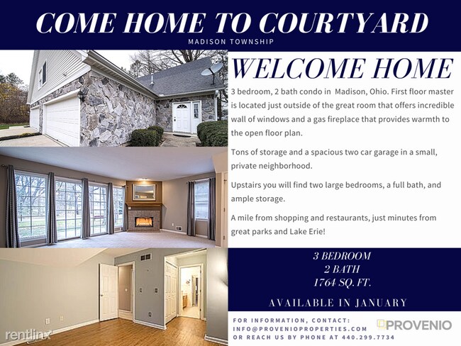 (440) 840-2837 - Private Condo in Madison, OH - Property Id: 439360 3 bedroom, 2 bath condo in desirable Madison, Ohio. The first floor master is located just outside of the great room that has soaring ceilings and a gas fireplace providing warmth to the open floor plan. Beautiful new windows offer sunlight and view of the wooded patio. Tons of storage and a spacious two car garage in a small, private neighborhood. A mile from shopping and restaurants, just minutes from great parks and Lake Erie! Cats and dogs welcome, some breed restrictions apply. One time fee of $300 applies. First pet is $30/mo and each additional pet is $15/mo. Maximum 2 pets. No smoking permitted Renter responsible for gas and electric. Water and trash is included. Lease terms 1 year minimum. Security deposit 1 month's rent. First month's rent due at signing. Apply at TurboTenant: http://rental.turbotenant.com/p/6683-courtyard-dr-madison-oh-unit-4/439360 Property Id 439360 (RLNE6274529) Other Amenities: Other (Cable Ready). Appliances: Dishwasher, Refrigerator, Range, Oven, Garbage Disposal, Washer & Dryer, Other (Freezer), Microwave. Lease lengths: 12 Months. Utilities: Water Included, Trash Pick-up Included. Pet policies: Small Dogs Allowed, Cats Allowed, Large Dogs Allowed.