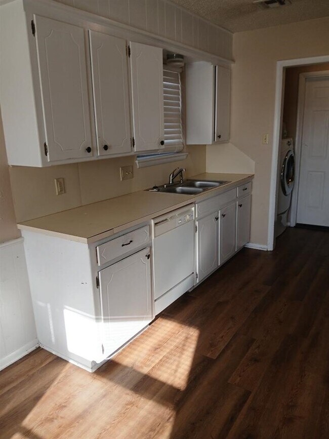 Get ready to fall in love with our stunning 3-bedroom 2-full-bath single-story ranch home that features a combination of light-colored brick and white siding. It includes a spacious two-car garage and a wide concrete driveway under a clear. The living room showcases a neutral color palette with beige walls and consistent wood-style flooring, highlighted by abundant natural light. The narrow, well-equipped galley-style kitchen features white cabinetry, matching white appliances, and warm wood-look flooring.