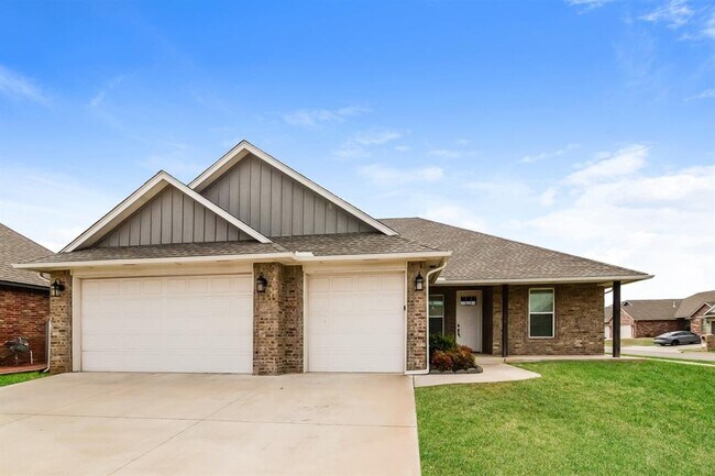 Beautiful 4-bedroom,2-bath executive home featuring granite countertops and abundant storage throughout,located in the Mustang School District! The spacious primary suite includes a luxurious bath with a deep soaker tub,standalone shower,dual sink vanity,and walk-in closet. Enjoy a cozy fireplace in the living room and a kitchen with a convenient breakfast bar,walk-in pantry,and stainless steel appliances. Additional highlights include a 3-car garage and a covered front and rear patios—perfect for relaxing or entertaining. Tours: To ensure a secure process,please schedule tours and apply for our properties exclusively through the official Evergreen Live website.