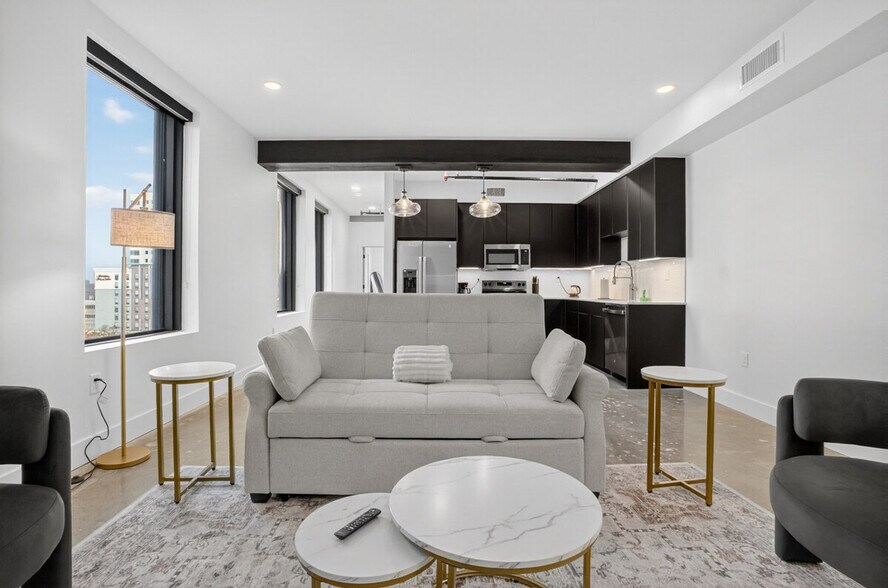 Feel at home in this modern 2-bedroom industrial loft in the historic Beacon Building, just one block from the BOK Centre. Enjoy skyline views and 12-ft ceilings in this spacious apartment. The loft features 12-foot ceilings, large windows, and exposed steel accents, creating an airy, industrial-modern vibe. The open and bright living area includes a Smart TV and fast Wi-Fi. The kitchen is fully equipped for cooking. You'll also have a combo washer/dryer and central A/C and heat. Paid parking is available for $10 per night on weekdays and $15 per night on weekends. Beginning January 1st, guests can access the brand-new fitness center, dry sauna, and resident lounge. Centrally located in Downtown Tulsa’s Entertainment District, this apartment is steps from the BOK Center and minutes from everything downtown. Cain’s Ballroom is about 13 minutes walking or 3–4 minutes driving, and the Cox Convention Center is 3 blocks away. The Tulsa Performing Arts Center is an 8-minute walk away. Enjoy nearby dining favorites such as The Vault, Juniper, Elgin Park Brewery, Fassler Hall, and Antoinette Baking Co. Cultural highlights such as Philbrook Downtown, Woody Guthrie Center, and Greenwood Rising Museum are close by, and Guthrie Green, with live events and markets, is a 10-minute walk away. The Gathering Place, an award-winning riverside park, is a 10-minute drive away. No events or parties are allowed per city ordinance. A $150 penalty will be imposed if the camera is disconnected, tampered with, or relocated from its original position. Items left behind will be held for up to 14 days; if you'd like an item returned, a $35 lost and found management fee will apply, and guests are required to provide a prepaid shipping label for the return. [SI]