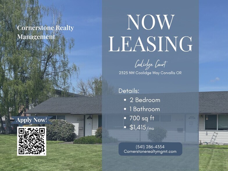 Property Id: 2321664 Enjoy a great location just blocks from OSU, Fred Meyer, restaurants, and parks at this charming garden-style apartment community in Corvallis. Residents benefit from off-street parking, coin-operated laundry, and a peaceful setting close to shopping, dining, and outdoor recreation. For more information or to apply, visit our website: Details: - Screening Charge: $50 per applicant (18+) - No Pets Allowed - Utilities: Water/Sewer/Garbage included. Electricity is tenant responsibility. Note: Images and square footage may vary from the actual unit. Take the next step toward easy Corvallis living, apply now! Managed by Cornerstone Realty Management