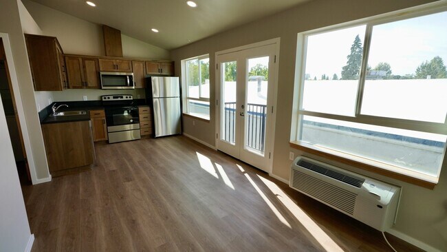 This upper floor loft unit features high ceilings, overhead storage, large windows, in-unit laundry with machines provided in the walk-in closet, parking in the private lot & on-street, a Juliet balcony with French doors that fully open the unit to the outside air, and built-in heating & AC. Rent includes water, sewer & trash. Electricity is through Mac Water & Light and internet is via Ziply fiber - the building is wired for gigabit fiber, and your unit gets patched in as soon as you sign up with Ziply.