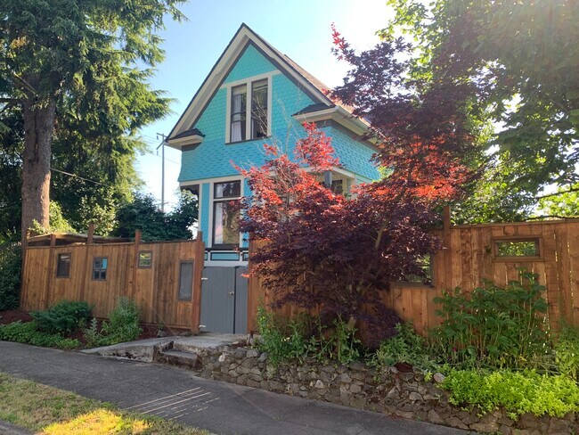 4Beds + 3 bonus rooms, Heart of Mississippi Ave Neighborhood/ Gardeners Delight $3,550 Large, light filled Victorian 4 Bedroom House in the Mississippi Ave Neighborhood with a quiet landscaped yard, shaded covered porch, patios, and bonus rooms. The main floor has two bedrooms, a sun lit dining room, living room, and mud room with built ins and wood floors throughout. The kitchen has all new appliances, five-burner range, xl refrigerator, microwave, and dishwasher, plus a walk-in pantry for extra storage. The second floor living area opens to a vaulted ceiling with skylights, a gas burning stove, with the two bedrooms off on either side. There is also a an office/ artist space with table surfaces built in, a 3rd floor sleeping loft, and a 2nd bathroom that has a clawfoot tub for soaking. Air conditioning units provided. A stone path leads you through a landscaped, fenced in yard area filled with berries and grapes, pears, figs, flowers, and a large organic vegetable garden bed ready for more planting, two patios, and playhouse or garden shed. The covered back porch is an outdoor living room year-round with a heater. The gated back fence with a keyless lock provides access to the back alleyway. An additional basement entrance from the yard for transporting gear or bikes. Basement has plenty of storage, a high efficiency washer/ dryer, sink, furnace, and an on demand hot water heater which keeps utilities costs low. Also provided is a workbench and open shelving space. 2-4 blocks walk to coffee shops, #4 bus, food cart pod, park, bars, restaurants, Albina Press, Proust, Matt’s BBQ, Bridgetown Brewhouse, Land Gallery. Walking distance to Cherry Sprout Groceries, New Seasons, Mississippi Records. Walking distance to PCC, Peninsula Park. and EZ access to 1-5. $3,550 rent. $3,550 deposit. 1 year lease We take care of landscaping, tenant does the watering NO smoking on property. No pets, no exceptions due to health issues Move in date is May 10th- 26th. Contact us to schedule an appointment to view the house, not ADA Accessible