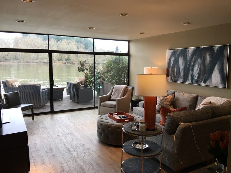 Sorry all the photos I have are dated, before we put in all new windows, doors and mini splits. Will work on updating these soon. Floating home, townhouse, located minutes from downtown Portland, right on the Willamette bike trail. 2 story townhouse, stainless kitchen, all new windows, floor to ceiling according wall, indoor outdoor living. Heat and AC with brand new mini splits thru out home. 2 masters with gorgeous views and roof deck acces, to have a front row seat for the Oaks Park firework show. Summer time, the old Lake Oswego antique trolly goes by and will pick you up in the parking lot and take you to the South blocks or catch it on the way back and go to Lake Oswegos farmers market. Beautiful view of Mt St Helens on clear days and a fantastic view of the new Sellwood Bridge. Wild life is absolutely amazing, beavers, otters, eagles, off spray, sea lions... 2 Kayaks, 1 canoe available for your use. 1/2 bath laundry room on first floor. Our tenant will be moving out in June, we are putting in new carpet in bedrooms, luxury vinyl 1st floor and other upgrades, so will be available for move in on July 1st. Can NOT see it until tenant moves out! Would be happy to show you around the outside by appointment ONLY! DO NOT walk around the home uninvited! 1 year lease ONLY NO month to month! It is a duplex townhome, we live on one side and rent out the other side. NO cats, NO smoking! Dogs ok but have to get along with our dogs and you must follow all dog rules and laws. NO subleasing! Must pass criminal background check! 1 tandem (2 car parking space) included. Water, sewer, garbage included. NO garages available. Small outdoor storage for bikes and tools.