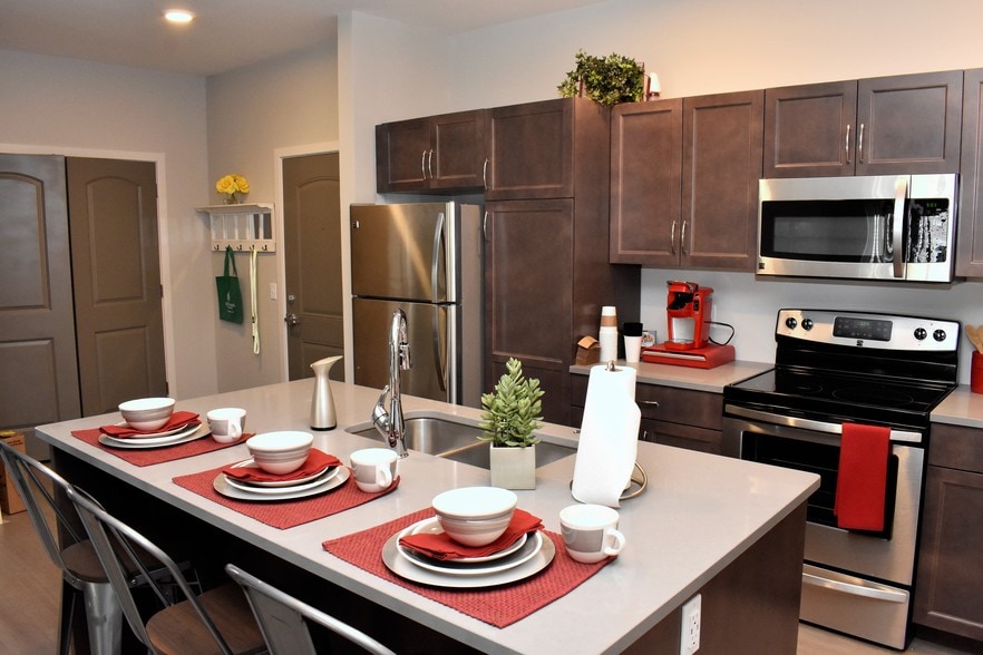 -Modern self-closing kitchen cabinetry, Quartz countertops and island, energy efficient stainless steel appliances