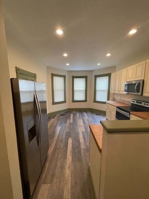 A totally remodeled, first floor apartment, large one bedroom, primary bath with tub and a fully-tiled walk-in shower, half-bath off living room. Gourmet kitchen with brand new stove and dinette area; custom European cabinets. New vinyl plank flooring and recessed lighting throughout. Washer and dryer. Large covered porch. Off-street parking for one vehicle.