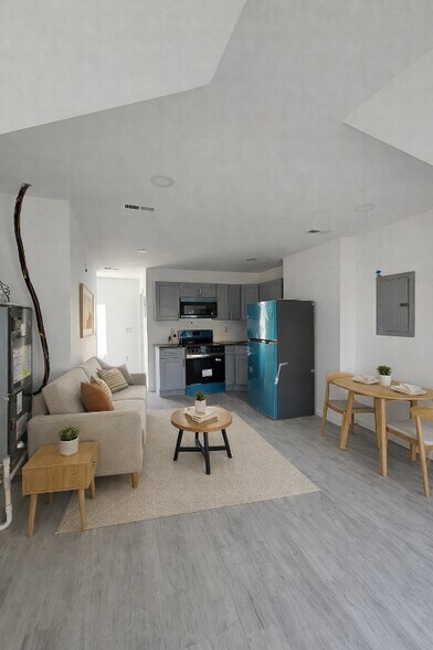 Property Id: 2248432 Bright and modern open-concept unit featuring a sleek kitchen with gray cabinetry and stainless steel appliances, seamlessly flowing into a comfortable living area. The thoughtfully staged layout highlights the versatility of the space, perfect for relaxing or entertaining. Light flooring, recessed lighting, and neutral finishes create an airy, contemporary feel throughout. Ideal for efficient city living with a modern touch. Property is virtually staged
