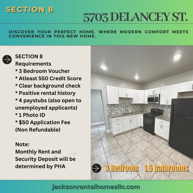 Welcome to 5703 Delancey Street — a beautifully updated 3-bedroom, 1.5-bathroom home offering space, style, and comfort in a prime West Philadelphia location. This spacious house is perfect for families or anyone looking for room to grow, and Section 8 vouchers are welcome! Step onto the welcoming front porch, then into a bright and airy interior featuring gorgeous hardwood floors and generously sized rooms throughout. The living and dining areas flow seamlessly, creating a perfect space for relaxing or entertaining guests. Each bedroom includes a ceiling fan for added comfort year-round. The modern kitchen is a standout feature, equipped with a sleek black stove and refrigerator, a stainless steel microwave, granite countertops, stylish backsplash, and contemporary cabinets with silver fixtures. It's a space designed to make cooking both easy and enjoyable. A full bathroom on the upper floor and a convenient half bath on the main level provide added convenience for busy households. Located just minutes from Andrew Hamilton School and William L. Sayre High School, this home is ideally situated for families with school-aged children. Public transportation, shopping, and parks are all nearby, offering added ease and accessibility. Whether you're relaxing at home or exploring the neighborhood, 5703 Delancey Street offers the comfort, space, and location you've been searching for. Section 8 Requirements * 3 bedroom voucher * Atleast 550 Credit Score * Clear background check * Positive rental history * Must be working cause will be asking 2 paystubs (If not, as many proof of income as you can provide.) * 1 Photo ID * $50 Application Fee (Non Refundable) Note: Monthly Rent and Security Deposit will be determined by PHA