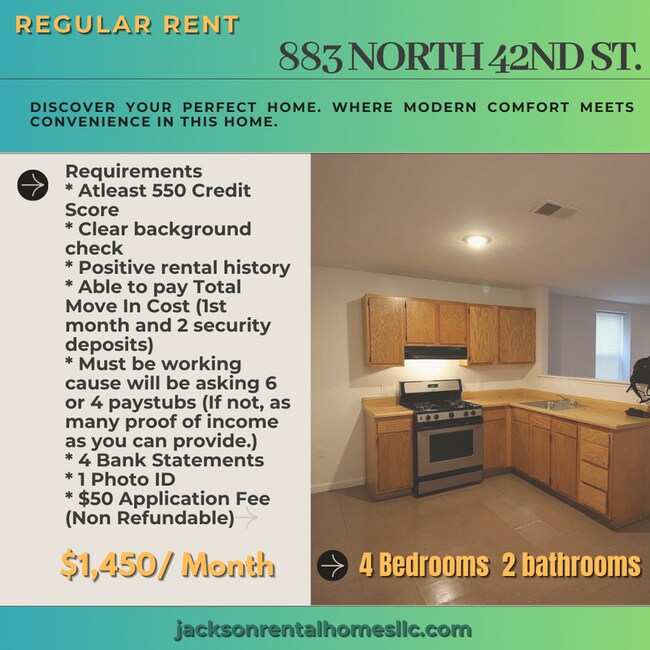 $1,450/ Month Requirements * Atleast 550 Credit Score * Clear background check * Positive rental history * Able to pay Total Move In Cost (1st month and 2 security deposits) * Must be working cause will be asking 6 or 4 paystubs (If not, as many proof of income as you can provide.) * 4 Bank Statements * 1 Photo ID * $4.99 Application Fee (Non Refundable)