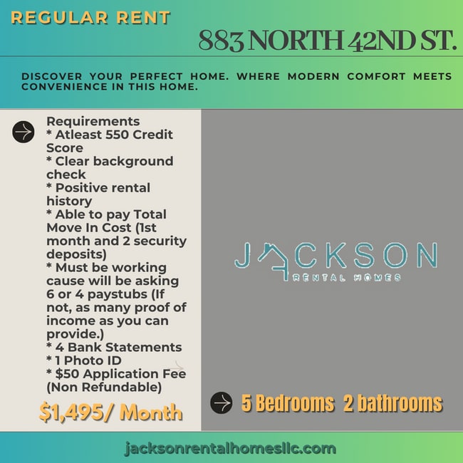 Welcome to 883 North 42nd St., 1st Floor, a rare find offering incredible space and comfort at just $1,495/month. This expansive 5-bedroom, 2-bathroom apartment boasts approximately 1,700 square feet, giving you plenty of room to spread out and make it your own. Inside, you'll find beautiful hardwood floors that add warmth and character to the living areas. The kitchen comes equipped with a stove, making meal prep convenient and practical. Each of the nicely sized bedrooms provides generous space for rest, work, or study—perfect for larger households or those who simply enjoy extra room. The apartment features two tiled bathrooms, each with a tub, adding both convenience and comfort for busy mornings or relaxing evenings. The layout is both spacious and functional, giving everyone in the household the privacy they need. One standout feature of this property is the yard, a bonus space where you can enjoy the outdoors, entertain, or simply relax. Plus, the location is excellent, just a few blocks from Belmont Charter School and close to local shops, parks, and transportation options. At $1,495/month, this is an exceptional opportunity to secure a spacious home in a convenient neighborhood. Don't wait, schedule your showing today! $1,495/Month Requirements * Atleast 550 Credit Score * Clear background check * Positive rental history * Able to pay Total Move In Cost (1st month and 2 security deposits) * Must be working cause will be asking 6 or 4 paystubs (If not, as many proof of income as you can provide.) * 4 Bank Statements * 1 Photo ID * $4.99 Application Fee (Non Refundable)