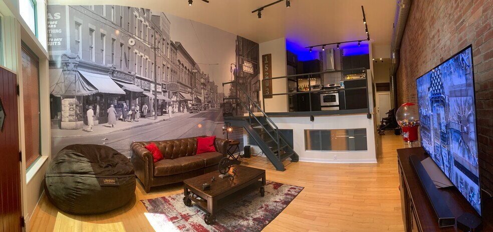 This truly one of a kind South Side Flats loft is a standout. With a lofted, fully equipped kitchen that overlooks the design forward living space below, the layout feels open, dramatic, and architecturally unique. The kitchen includes a dishwasher and garbage disposal, while bamboo flooring and exposed brick create the perfect blend of warmth and industrial character. High ceilings and a bold South Side mural give the space authentic Pittsburgh charm. The oversized sunken bedroom offers privacy and separation, while a bonus loft area provides flexible space for guests, a home office, or additional lounging. A full size in unit washer and dryer add everyday convenience. Unlike most city lofts, secure garage parking is included, a rare and valuable perk in this vibrant neighborhood.