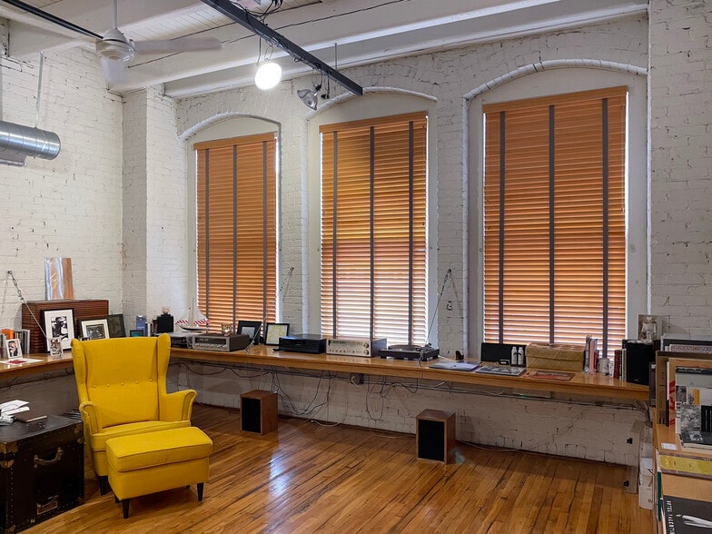 Enormous bay windows looking down the length of Smithfield Street, high ceilings framed with deep wooden ceiling beams, white plastered walls, an open kitchen, full bath, and study/bedroom space in back with huge rear windows. A singular historic, warehouse building with live/work neighbors.