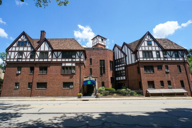 The brickwork, use of half-timber, and the curved stairway in the lobby sets the tone for this Tudor style building - located within walking distance of Oakland's nightlife.