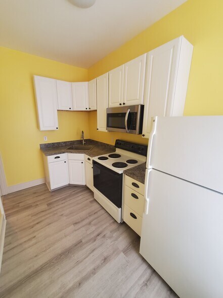 Completely renovated 2nd FL 1-bedroom Frt. Apt, 600 sq. This spacious 1-bedroom, 1-bath apartment is close to town, shopping, and transportation! This is a quiet, well-cared-for Art Nouveau home with stained glass and beautiful woodwork, located in a nice area on a tree-lined street. That has been freshly painted in custom colors, with new premium vinyl wood flooring throughout, new windows, a new kitchen, counters and cabinets, a stove, a microwave, and a refrigerator provided. The Bath Features A New Refinished Tub/Shower Combo With Gray Subway Tile And New Fixtures, Spacious Living Room With Large Window With A Great View And Overlooking Open Space, Go Down The Hallway With A Ceiling Fan To The Large Bedroom With Closet, Lots Of Windows, With New Blinds, That Allows Natural Light In! Building security cameras throughout the property. No Pets.