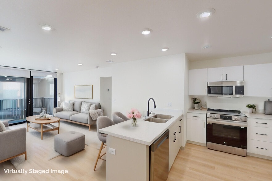 Natural light floods through floor-to-ceiling windows, creating an inviting welcome home each day. Modern black finishes decorate every detail, from faucets to door handles, enhancing elegance throughout. Moving into the heart of the apartment, discover modern luxury in the kitchen with sleek surfaces, ideal for meal preparation or entertaining guests. Custom painted cabinetry adds a personalized touch, maximizing efficiency and convenience. Light-toned flooring connects each room, enhancing the flow of your home.