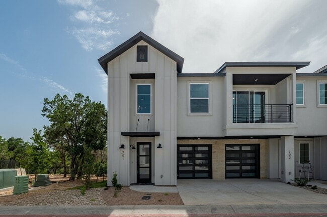 New construction townhome community in Four Points backing to a nature preserve with beautiful Hill Country views. This end unit only shares one wall and features an upgraded finish out package including LVF wood floors, an open wood staircase, white shaker cabinets with quartz countertops throughout, and a collection of upgraded tile. The private yard is fenced and is surrounded by tree shade. Refrigerator, washer, dryer, and blinds included. Conveniently located next to shopping, dining, and entertainment in Four Points!