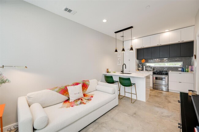 Find yourself at home in this nearly new construction, 2021 luxurious East Austin loft. Thoughtfully designed with high quality materials, energy star water heater and windows. Downstairs enjoy luminous concrete floors, a modern kitchen with black and white penny tile backsplash, gas range, retro black Galanz refrigerator and microwave, floor-to-ceiling European cabinetry, undermount sink, black hardware and beautiful quartz countertops with a breakfast bar. The master ensuite located on the second level has an abundance of natural lighting with large windows, winter views of downtown, luxury vinyl plank and tall ceilings. Beautiful master bath includes designer tile with floor-to-ceiling finish in walk-in shower, walk-in closet with convenient direct access to stackable W/D. Reserved parking space with EV charging and other spots available for guests. Private xeriscaped front yard entry where you can add a small garden or seating area, and common area dog park directly behind unit. Urban living condo with amazing location - walking distance to Greenbelt or Mueller, including 6.5 acre park around the community lake. Enjoy the picnic areas, restaurants, coffee shops, farmer's market, and all the other great things that bustling Mueller has to offer. Easy access to UT, Downtown, bars and nightlife. Flexible move in! Option to have furnished. Pets allowed with a weight limit of 40 lbs or less. Pet deposit and fees apply. Schedule a tour today! 2108 Tillery St is a condo located in Travis County and the 78723 ZIP Code.