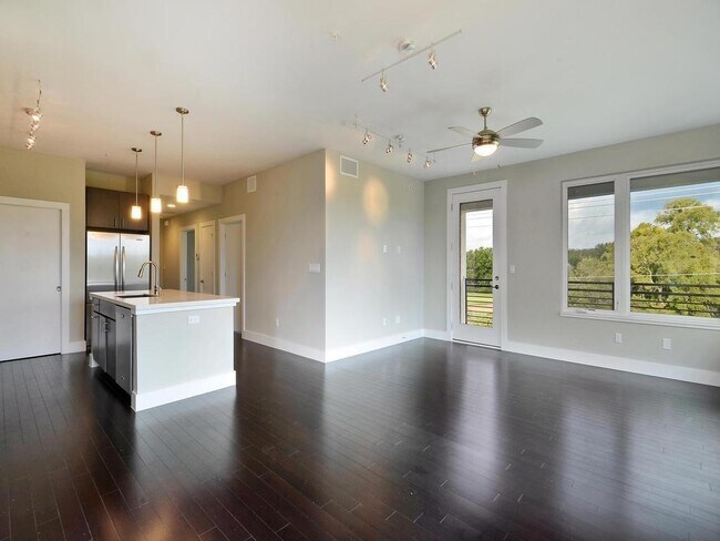 Tarrytown 2013 construction! Premium top floor corner unit with golf course views. Spacious 3 bed / 2 bath, large and open and bright living / dining / kitchen, lots of natural light, balcony, full-size stackable washer/dryer, 2 secondary bedrooms share a hall bath with double sinks, and master bedroom featuring a large master bathroom with walk-in shower, walk-in closet, separate toilet room, and nice storage. The kitchen features stainless steel appliances, Quartz countertops, wood floors, island in kitchen, and walk-in pantry. 2 off-street parking spaces. Storage closet included.