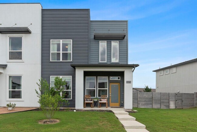 FOR LEASE in Goodnight Ranch!! Amazing 2 STORY END UNIT TOWNHOME! This stunning 3BD/2.5BA/1844 sq ft contemporary duplex home is located in the highly sought-after Goodnight Ranch community in SE Austin. This amazing two-story home was just built in 2021! The immaculate interior offers a luminous open floor plan for the main living room, dining area, and kitchen. Featuring gorgeous wood-like tile flooring throughout the main level and cozy carpet in the upstairs bedrooms. An abundance of natural light flows through oversized windows. You’ll love the sleek, modern island kitchen with inviting breakfast bar seating, white granite countertops, designer tile backsplash, stainless appliances (gas range), fridge, a pantry, and a convenient desk area for planning your weekly meals. The spacious 2nd floor primary bedroom features a large walk-in closet and its own luxurious private ensuite bathroom with spacious contemporary vanity and an amazing glass-enclosed walk-in shower with bench seating. Two guest bedrooms upstairs share a gorgeous secondary bathroom. The washer & dryer will remain. A covered back patio is the perfect place to relax and enjoy the privacy of your own perfectly sized, fenced-in backyard. This home features a spacious two-car (detached) garage, which can be accessed from the alley behind the homes. A walkway from the garage leads to the backdoor of the home. Goodnight Ranch is a newer development and a master-planned community with incredible amenities. Residents enjoy community ponds, pocket parks, a community pool (a short walk from the home), gathering spaces, picnic areas, and hike & bike trails. Enjoy living within walking/biking distance to the recently renovated Onion Creek Greenbelt and Park. Just minutes to South Park Meadows with tons of shopping, dining, and entertainment options. Easy access to I-35 and just 20 minutes in traffic to downtown Austin and only 15 miles to Tesla.