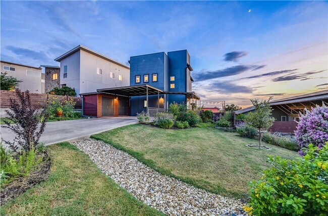 Embrace contemporary living in this exceptional 3-bedroom, 2.5-bath home, nestled within the coveted Agave neighborhood. As part of an all-modern, green-built community envisioned by leading architects, this residence offers an incredible living experience. Located on a peaceful and quiet street, the home provides a 2-car carport and an impeccably landscaped front yard that's been transformed into a vibrant garden filled with native plants. Your private front porch is an ideal spot to unwind and soak in the tranquil surroundings. Inside, you'll find an inviting open floor plan, featuring low-maintenance stained concrete flooring, high ceilings, and an abundance of natural light. The living area effortlessly connects to the dining room and the modern kitchen, making it a fantastic space for gatherings and daily living. The kitchen is a standout feature, showcasing contemporary cabinetry, granite countertops, and a generously sized center island. Stainless steel appliances add both style and functionality, making it a dream space for chefs and entertainers alike. A floating staircase leads to the second floor, where you'll discover all three bedrooms. The primary suite is filled with natural light and offers a contemporary bathroom with a dual vanity and a walk-in shower, providing a spa-like experience. Step outside to the expansive back deck and be captivated by the breathtaking downtown views from the backyard. Solar panels ensure both eco-friendly living and reduced electric bills. Agave offers direct access to the Southern Walnut Creek trails, perfect for those who appreciate walking, jogging, or bike rides. The superb location is the icing on the cake. Downtown and UT Austin are just 6 miles away, and the Austin-Bergstrom Airport is only 8 miles from your doorstep. Major highways, including SH 130, US Hwy 183, and Hwy 290, are within minutes. Experience the best of Agave living here at 5408 Sendero Hills Pkwy!