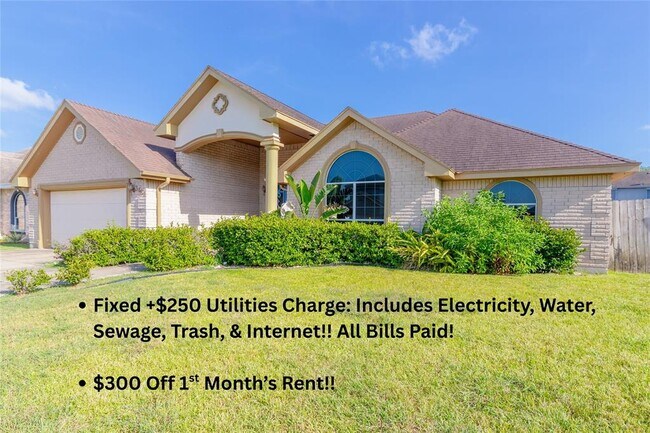 Beautiful single-story brick home offering spacious living, timeless curb appeal, and a desirable neighborhood lifestyle. This well-maintained residence features an open and functional floor plan with generous living areas, abundant natural light, and a large kitchen with extensive cabinet storage, tile countertops, breakfast bar seating, and plenty of prep space. The oversized covered back patio is ideal for relaxing, entertaining, or enjoying the private fenced backyard. The primary suite and secondary bedrooms provide comfortable space and flexibility for families, guests, or a home office setup. Mature landscaping, a 2-car garage, and strong curb appeal complete the package. Enjoy simplified monthly budgeting with a fixed $250 utility payment covering electricity, water, sewer, trash, and internet. The home is equipped with solar power, offering an eco-friendly and energy-conscious lifestyle. Located in an established community with private access to neighborhood walking trails and a playground. Convenient to major roadways, shopping, dining, and everyday essentials. Special Offer: $300 Off 1st Month's Rent! MLS ID 1730790