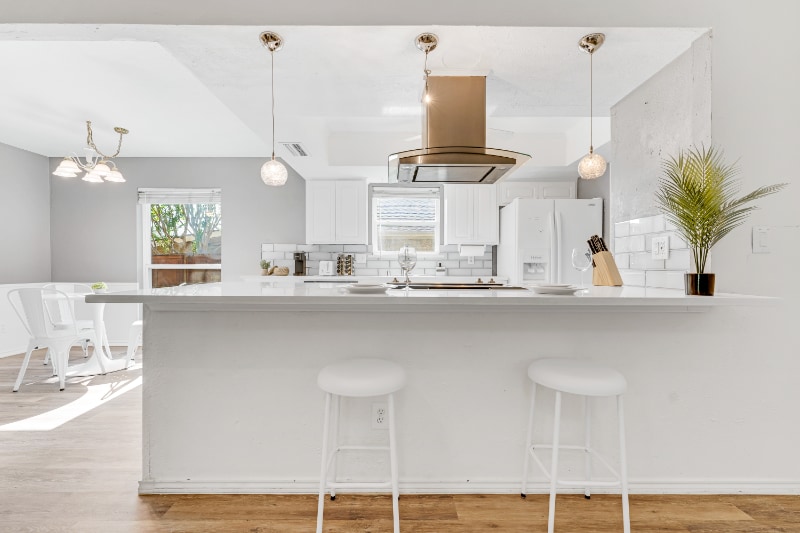 Our spacious 4-bedroom, 2-bathroom home includes 1 king bed, 1 queen bed, and 4 twin beds. One bathroom has a tub, and the other a shower booth.