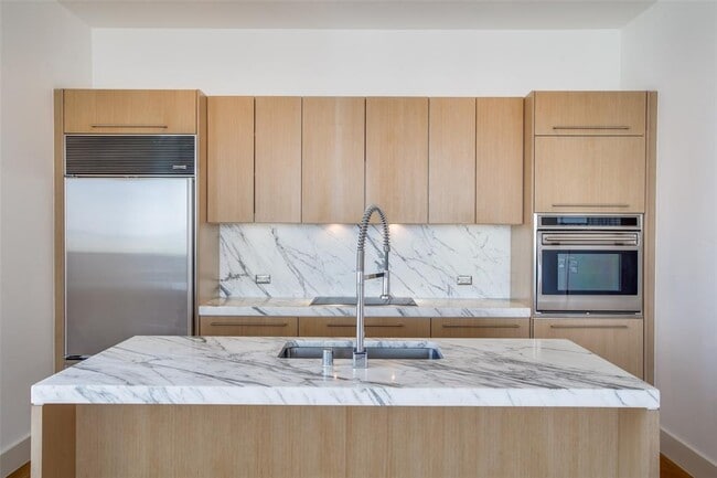 Live at The House, a Starck & Yoo designed high-rise in Victory Park. 10th floor residence with floor to ceiling windows that overlook the park in Victory Park and sunset views of the Margaret Hunt Hill Bridge. Kitchen with Statuary marble counters and backsplash, Sub-Zero, Wolf and Asko appliances. Marble bathroom with separate bath and shower, white oak hardwood floors, museum finish walls. Modern design in a generous floor plan. Amenities of the building include the pool terrace with a 130 ft saline infinity pool, gym, and lounge. Services include concierge, valet, and 24 hour security.