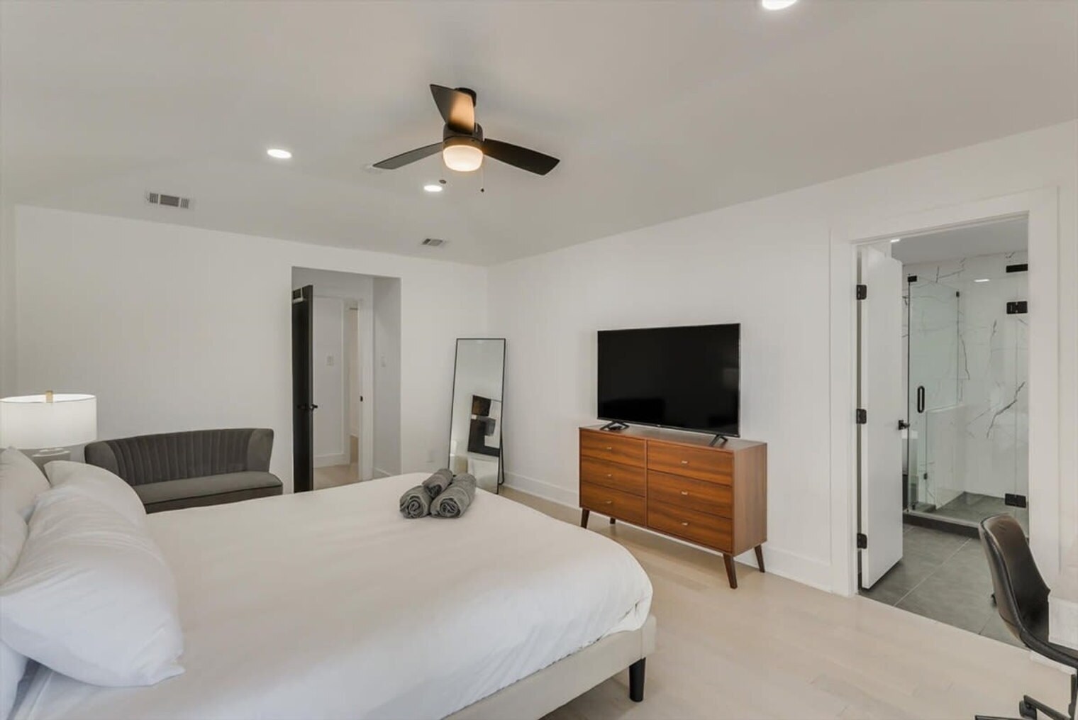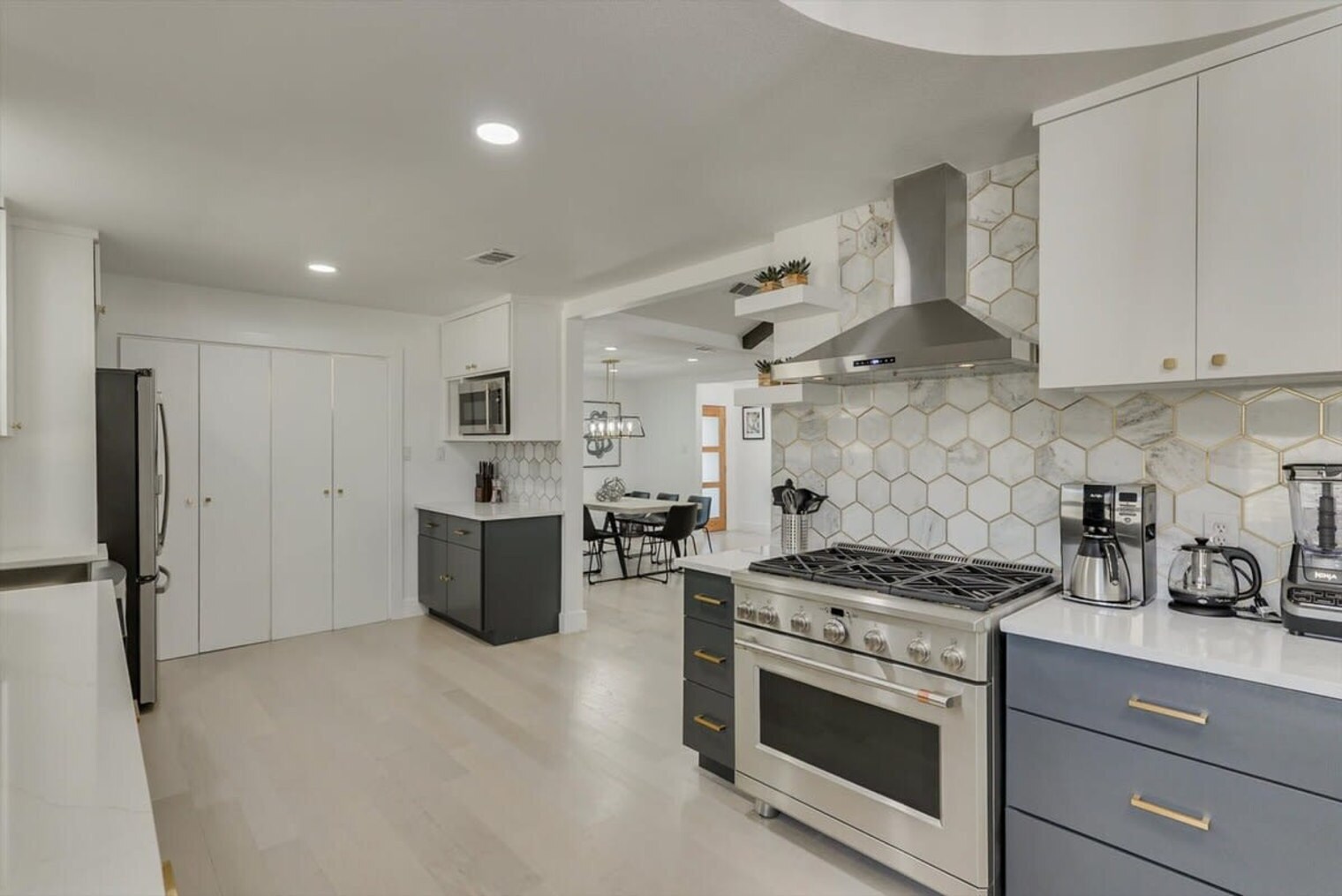 This 5-bedroom, 3-bathroom bungalow in Dallas offers the luxury of a high-end hotel with the comfort and space of a home. With lavish décor and high-end finishes, you'll truly feel at home. Enjoy cooking in the fully equipped kitchen or take a dip in the pool in the backyard oasis. This property is ideal for large groups, whether you're resting between activities or relaxing at home. This home caters to both short-term and medium-term stays, making it an excellent choice for corporate housing needs. The interior is beautifully renovated with a spacious open-concept and brand-new flooring throughout. High-end features and finishes make this feel like a luxury home, accented by luxe décor and furnishings. The living area features vaulted ceilings and exposed beams, creating a warm and spacious atmosphere. Gather around the cozy furniture and wood-burning fireplace. The kitchen boasts a stunning backsplash, gold faucets and handles, and top-of-the-line appliances. With 5 large bedrooms, there's plenty of room for everyone to spread out. Two rooms feature French doors leading to the backyard with a pool view. The bathrooms are modern and sleek, with the master bath offering a walk-in shower, soaking tub, and double vanity. The backyard is a relaxing oasis with a covered patio, lounge chairs, and a hammock. Pets are welcome with a non-refundable pet fee of $150 per pet, with a maximum of 2 pets per stay. An additional nightly rate applies for more than 6 guests, with a $29/night fee for each additional guest. The fireplace is wood-burning, and guests are asked to refrain from using it without prior approval. Smart TVs are equipped with streaming apps, and guests can log in with personal accounts. Located in the sought-after Prestonwood neighborhood of Far North Dallas, this home is just 5 minutes from the University of Texas at Dallas campus. Downtown Dallas Main Street and DFW airport are 25 minutes away. Nearby attractions include the Perot Museum of Nature and Science, Dallas Museum of Art, and The Sixth Floor Museum. Closer to home, you're 12 minutes from Eisemann Center and 20 minutes from Go Ape Zipline and Adventure Park. There are also golf courses, shopping centers, and parks nearby. Smoking is not allowed, and violations are subject to a $450 fine plus cleaning costs. Check-in is at 4 pm, and check-out is at 10 am. No parties or events are allowed, and only registered guests are permitted. Noise levels are monitored to comply with local ordinances. Room #5 is opened for groups of 12 or more guests. Pets should be discussed in advance, and pet cleaning fees apply. Small gatherings are allowed upon request and approval. Registration Number: 474418 [SI]