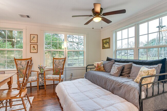 Feel at home in this 3-bedroom, 2-bath Dickinson vacation rental in the Lone Star State. This 2-story home requires two steps to enter, and the bedrooms are on the second floor. The home has an open-concept living area, a full kitchen, and outdoor spaces. It features four smart TVs, a dining table, a breakfast bar, a kids’ playroom, toys, books, a furnished patio and porch, a dining area, a natural gas grill, a wood-burning fire pit, a fenced yard, and a chicken coop. The kitchen includes a refrigerator, gas stove, oven, dishwasher, dishware/flatware, cooking basics, a Keurig coffee maker with starter coffee, a tea kettle, and a microwave. You'll also find linens/towels, a washer/dryer, a hair dryer, starter shampoo/conditioner/body wash, and alarm clocks. Pets are welcome with a $100 fee. Parking is available in the driveway for one vehicle and in an additional area for two vehicles. Head down to Galveston and take the kids to Moody Gardens, or visit Houston for sightseeing and live entertainment. After your adventures, gather around the fire pit for stargazing and s’mores. Smoking, events, parties, and large gatherings are prohibited. This property features four exterior security cameras: one camera is next to the front door facing the front entry area, one camera is on the back fence facing the chicken coop, one camera is behind the property facing the chicken coop, and one camera is on the front of the property facing the driveway. These cameras are outward facing and record sound and video when activated by motion while guests are in residence. [SI]