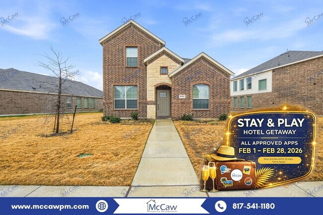 STAY & PLAY HOTEL GETAWAY*** FOR ALL APPROVED APPS, FEB 1–28, 2026 (FEES MUST BE PAID AND MOVE-IN DATE SCHEDULED) Wonderfully spacious, nearly-new home in the Northpointe community of Fort Worth will be ready for move-in as early as February 1st! Built for the way you live today, this 2,277 sq ft two-story offers 3 bedrooms, 2.5 baths, and a rear-entry two-car garage - plus the modern layout and finishes you’ve been looking for. On the main level, you’ll love the dedicated study - perfect for working from home, tackling projects, or keeping life organized. The first-floor primary suite feels like a true retreat with an en-suite bath and a roomy walk-in closet. Just down the hall, the open-concept living area flows into a standout kitchen with a quartz-topped island, breakfast bar, pantry, refrigerator included, and tons of storage (including a seriously impressive storage closet you’ll actually use!). Upstairs, two bedrooms share a central loft that’s ready to become your media room, second living space, game room, or workout area - whatever fits your lifestyle. Enjoy the backyard with covered patio & make use of the HOA amenities - pool, playground & park! Apply today and make this your next home! Dogs welcome with prior approval, deposit & pet monthly rent! No cats, please. We are excited to offer a deposit alternative in lieu of a traditional cash security deposit for select properties. At McCaw Property Management, we strive to provide an experience that is cost-effective and convenient. That’s why we provide a Resident Benefits Package (RBP) to address common headaches for our renters. Our program handles pest control, air filter changes, credit building and more at a rate of $45.00/month, available to every eligible property upon resident election. More details upon application. AMENITIES: * HOA Community Pool * HOA Playground * Covered Recreational Area with Grills By submitting your information on this page you consent to being contacted by the Property Manager and RentEngine via SMS, phone, or email.