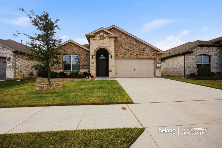 A newer single-story home in Haslet's Sendera Ranch community, where clean construction and an open layout make 2,014 square feet feel genuinely spacious. The kitchen is the clear focal point: gray shaker cabinets with black hardware, white quartz countertops, a large center island with a built-in sink, and a full suite of stainless appliances including a gas range. It opens directly to the living area with no visual break, creating a connected space that works well for everyday living and hosting alike. Recessed lighting and plantation shutters carry through the main living zone, with light LVP flooring underfoot and an industrial-style ceiling fan anchoring the room. The primary suite includes a double-vanity bathroom with a frameless glass shower, white subway tile, and access to a walk-in closet. Three additional bedrooms give the layout real flexibility for families, a home office, or guests. All four bedrooms are on one level, which keeps the floor plan practical and easy to navigate. Out back, a substantial fenced yard with a wood pergola creates covered outdoor space well above what most rentals in this price range offer. The Sendera Ranch location puts you close to I-35W for Fort Worth access, with everyday conveniences including Lowe's and local dining just minutes away. *Our homes come as-is with all essentials in working order. Want upgrades? Request it through the Belong app, and our trusted pros will take care of the rest!