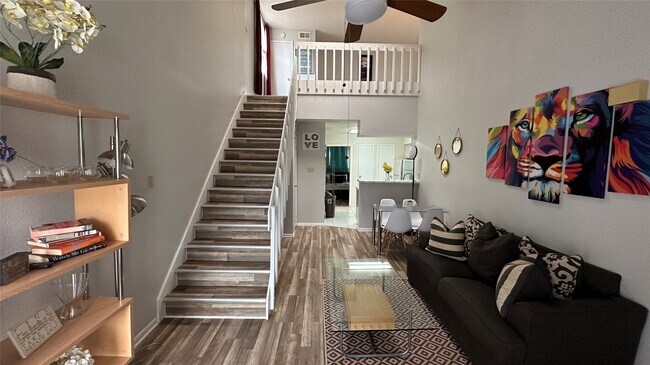 Welcome to this charming FURNISHED one bedroom condo featuring a versatile loft space ideal for an extra sleeping area,home office,or extra storage. Located in the quiet,gated Plaza Place Condominiums,the open-plan layout offers vaulted ceilings and abundant natural light,with easy-care flooring and a functional kitchen area. The loft adds valuable living flexibility,and the community amenities include a swimming pool,tennis courts,and lush courtyard,all just minutes from the Texas Medical Center,NRG area,and an abundant of shopping and activities. MLS# 3837002