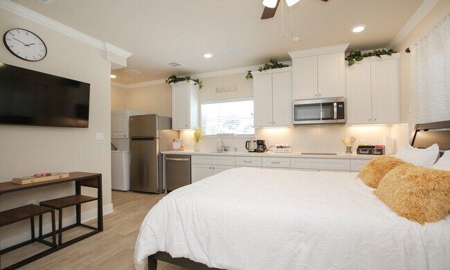 Tastefully decorated, fully FURNISHED Studio Room with ALL Bills PAID - for you to enjoy the ultimate living experience in peace and tranquility near The Medical Center & Downtown Houston. For your convenience and comfort, we have included extra upgrades like: 1) Full Kitchen with Dual Electric Burner Cooktop, Microwave, Sink, Dishwasher, Refrigerator, Washer and Dryer Dinnerware, Cookware, Cutlery, Electric Tea & Coffee Pots, Toaster, etc... Full Bathroom with Double Sinks, Towels, Hair Dryer, etc.... Spacious Walk-in Closet with Shelves, Hangers, Hot Iron & Ironing Board. 2) 50" wall mounted smart-TV & Wifi enabled 2 ceiling mounted Speakers in the Bedroom. FREE protected & dedicated Internet. 3) Password protected Keyless Entry. Well-lit Driveway, Walkway, Patio & Backyard. You will enjoy easy access to everything that HOUSTON has to offer from this captivating, modern, and centrally located Newly Constructed Studio Room.