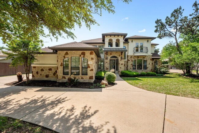 GOLF COURSE VIEW, POOL At the end of the cul-de-sac, with a spectacular view of the Live Oak Golf Course. Recently remodeled. Nestled at the end of a quiet street behind Lakeway Airport and near the marina, it boasts a spacious lot with mature landscaping for ultimate privacy. The dramatic entrance features a 22-foot stone-covered frontage and a French iron steel door, leading to a double-height foyer with a wood-style staircase and a stunning chandelier. To the left, a formal dining room with a striking chandelier sets an elegant tone. The open-concept kitchen, living, and breakfast area flow seamlessly, highlighted by travertine flooring, a wood fireplace, stainless appliances, granite countertops, and double ovens. A luxurious powder room adds a refined touch. The expansive primary suite on the first floor features wood ceiling beams, updated flooring, two large closets, and backyard views. The spa-like bathroom includes a large shower, soaking tub, and dual vanities. Adjacent to this is an extra-large private office featuring hardwood flooring, a built-in bookcase, and ample storage. The first floor also features a spacious utility room and access to a 2-car garage. Upstairs, all remodeled, an elevated game room accompanies three additional enormous bedrooms with large closets, two baths, along with a huge balcony overlooking the backyard’s golf course views. Outdoor living shines with a covered patio, waterfall pool, and lush greenery, creating a private oasis perfect for year-round enjoyment. ** Special preference for tenants interested in buying
