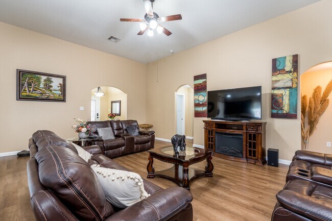Spacious property on an oversized ~15,000 sq ft lot offering exceptional flexibility and outdoor living. The main home features 4 bedrooms,2 full bathrooms,a comfortable big living room,and a dedicated dining area. Kitchen has granite countertops and stainless steel appliances. A garage apartment/studio includes a kitchenette and full bathroom—ideal for guests,extended family,or parent in law suite. Ample parking accommodates multiple vehicles with ease. Enjoy a large covered,tiled outdoor entertainment area complete with bar,kitchen setup,and ceiling fans,perfect for gatherings year-round. Expansive green space provides endless possibilities for relaxation or recreation. Property may be used for long- or short-term occupancy and can be offered furnished or unfurnished. Home will come with refrigerator,washer,and dryer. Come view this move in ready home that has it all!! MLS# 55753795