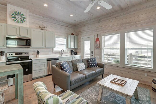 The advertised rate of $3,370/month is the lowest available price, based on a 1 month(s) stay with a move-in date of September 12, 2026. Rates vary depending on the duration of stay, season, and other parameters. For exact pricing and additional pricing components, please visit our website and enter your desired move-in and move-out dates. The rate is applicable when billed upfront; it can be higher if billed in multiple payments. Feel at home in this 2-bedroom house in Port Aransas, located in a prime location. This beach bungalow in Spencer's Landing is just a short drive from 11th Street. This home offers a fully stocked kitchen, a drip coffee maker, a washer and dryer, an outdoor shower, a BBQ grill, and TVs in each bedroom. The living room features a 55" TV and ample seating, with an open floor concept directing to the kitchen and dining area. Enjoy access to two community pools and boat parking for smaller boats. An outdoor TV is also available. Nearby attractions include Port Aransas Beach, Mustang Island State Park, Port Aransas Nature Preserve at Charlie's Pasture, Leonabelle Turnbull Birding Center, and Port Aransas Museum. Nearby restaurants include Coffee Waves, Port A Pizzeria, Seafood & Spaghetti Works, The Crazy Cajun, and Virginia's on the Bay. Check-in is at 4pm and check-out is at 10am. Parking is available for a maximum of 2 cars. Port Aransas is constantly evolving with ongoing construction, building projects, and community improvements. Island life comes with seasonal pests like mosquitoes, and while the property receives professional pest control treatments every month, cable and Wi-Fi connectivity might be unpredictable. There is an exterior camera installed to monitor the cleaning team for quality and security purposes. Pets are not allowed, and parties are not allowed. [SI]