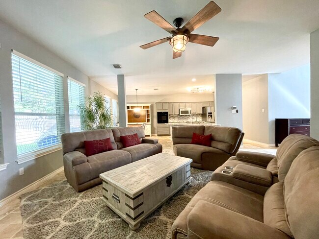 This super spacious gorgeous home is in the absolute perfect location! You can literally walk to HEB, Target, Academy, multiple banks, shopping, restaurants, salons, and more, everything is just around the corner! This home is in a small quiet neighborhood with gated and camera monitored entry. The community has a big pool, open pavilion, and playground which are all just the next street over from this home. The home is 2 levels with 2880 sq ft, 5 bedrooms (2 of them with full ensuite bathrooms)and 3.5 bathrooms total, the home was fully updated in 2019. This set-up is great for entertaining with an open floor-plan, multiple sitting options and lots of counter space in the kitchen. A fantastic and convenient feature is the reverse osmosis filtered drinking water system in the kitchen for great tasting water at your fingertips. The downstairs has custom villa-style stone floors with a beautiful inlay and extra tall foyer ceilings that greet you as you step in the front door. There is one large bedroom downstairs just off the living room that has its own ensuite full bathroom with step-in shower. Just upstairs you will find a massive loft area that is large enough to use as a double office and 2nd living area all at once! For added convenience, the laundry area is also located upstairs where the majority of the bedrooms are. Double doors off the loft area open to the large main bedroom suite which spans the entire right side of the upstairs. This bedroom has long bay-window and lovely view of the trees in the back yard. The main bathroom boasts a double shower with upgraded modern shower-heads on both sides! You will also have a big double vanity and separate toilet room for privacy. The big walk-in closet has its own window for natural light. On the other side of the loft area you will find the other three upstairs guest rooms (2 with walk-in closets) and the upstairs guest bathroom with convenient tub-shower combo. Home is equipped with two separate AC systems, one for each level, and solar screens on all windows to help keep temperatures comfortable in the hot months and added privacy during the day. Automatic programmable sprinkler systems in place to help keep the lawn looking great all year round. The two-car garage has automatic openers, a water softener system and space to put a second beverage fridge and work-bench if desired. This is truly an incredible opportunity to live in a gorgeous massive home with plenty of space for everyone AND in the perfect location, the convenience just can't be beat! *If you are looking to rent this home furnished that is a possibility at a higher monthly rate, make sure to ask when you contact us. Flexible length of lease could also be an option if needed. We welcome pets and will approve on a case-by-case basis. Residents pay for all utilities including electric/gas, water/sewer, and trash, renters insurance will be required for the duration of residence here. Showings scheduled upon request, we offer in-person and video walk-throughs. Please contact us by call, text or email for resident selection criteria and to schedule a tour prior to application. Call us up now and get ready to meet your new home!