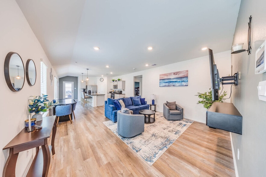 Feel at home in this centrally located, modern, and cozy family-friendly and pet-friendly home. This beautiful residence offers three bedrooms and two bathrooms, providing ample space for your family to relax and unwind. Conveniently located just 17 minutes from Bush Intercontinental Airport and 16 minutes from Six Flags and other waterparks, this home is perfect for exploring the vibrant arts scene and local dining and shops. Welcome to your home away from home! This beautifully designed house features a fully equipped kitchen, delightfully designed rooms, and thoughtful touches throughout. Whether you're here for vacation or work, this home caters to both short-term and medium-term stays, making it an excellent choice for corporate housing needs. The modern kitchen, with its stainless steel appliances and kitchen island, is perfect for unleashing your inner chef. The dedicated dining area offers a restaurant-like environment, while the charming living room provides a warm and inviting space to relax. The bedrooms are custom-designed for restful sleep, and the bathrooms offer spa-like features for a private retreat. Free parking is available on the driveway and garage. Pets are welcome with a surcharge to cover the cleaning fee. An inflatable waterslide for children is available upon request, and an additional nightly rate applies for more than five guests. Conveniently located just 17 minutes from Bush Intercontinental Airport and 16 minutes from Six Flags and other waterparks, this home is perfect for exploring the vibrant arts scene and local dining and shops. Enjoy the comfort and convenience of self-check-in, and make the most of your stay in this vibrant neighborhood. The property does not allow parties or large unauthorized gatherings. A noise alert device is installed to monitor decibel levels and ensure compliance with local noise ordinances. Only registered guests are allowed, and a pet fee applies for house-trained pets. Check-in is seamless with self-check-in instructions provided prior to arrival. Includes high-speed Wi-Fi, air conditioning, heating, and a washer/dryer for your convenience. The home is equipped with smart TVs featuring streaming apps like Netflix, Amazon, and YouTube, ensuring entertainment during your stay. [SI]