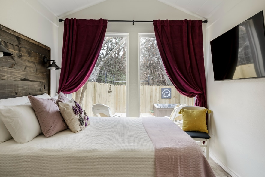 Outside, you will have a small yard surrounded by a privacy fence and a deck with patio furniture. The rent is $1,050 a month and that includes water, trash, and electric (with a cap) and internet. You will have a dedicated parking space inside a fence that surrounds the property. The deposit is $1,050,. Good credit (or a parent co-signer with good credit) is a must! It is available January 31, 2026 with a one-year lease. The cute space is perfect for mature college students (no parties) or singles looking for a unique space. It was a VRBO, but I have recently converted it to a long-term rental. Contact me to see it!