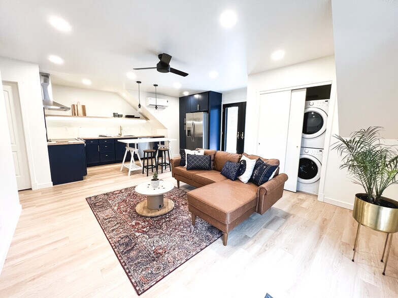Fully Furnished! This listing offers the privacy of a house, the convenience of an air-bnb, and a fully fenced yard with none of the maintenance! This brand-new loft apartment is located above a detached garage in the Jefferson Avenue historic district, and nine rails creative district. It's just steps away from the nearest BRT station, library, and Cuppa and a short 10-minute walk to downtown Ogden. The space is light and bright, with light oak lvt floors, custom cabinetry, stainless appliances, and an in-unit washer/dryer. We've integrated a small bonus room that can be used as guest-room, home office, or even a luxurious walk-in closet. The apartment has it's own large walk-out deck for BBQ-ing and hosting friends. The shared yard is fully fenced, and one compact off-street parking space is included. You can see more photos and video tours on insta @paintedladyandthecraftsman) We are flexible on the lease term, if you would like a shorter lease than the 6-months listed please reach out and we can chat. Please note that the yard and hot tub are shared with the main house and basement apartment on the same property. Pets must be friendly with other people and animals, and approved by owner. Additional pet deposit and monthly fee required for pets. Please note that an additional $200/month utility fee covers high-speed Comcast internet and all utilities! This unit is plug and play, no need to transfer/set up utilities.