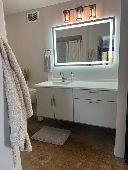 This thoughtfully designed unit features a stunning, high-end kitchen with quality cabinetry, sleek countertops, and modern appliances—perfect for anyone who enjoys cooking or entertaining. The open layout flows seamlessly into a bright and comfortable living space, highlighted by a 75” Samsung Frame TV that doubles as both entertainment and modern decor.