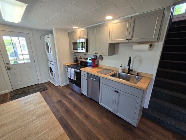 Winooski Vermont – Fully furnished unit (Not optional), prefer midterm rentals of 2 – 6 months. Ideally located within biking/bus distance to the University of Vermont Medical Center and Burlington. Residential neighborhood. Freshly remodeled. Includes dishes, kitchen and cooking items, bedding, linens, towels, etc.. Just bring your suitcase! One dog allowed with non-refundable pet fee. Photos do not reflect additional furniture recently installed. 2nd and 3rd floor unit with kitchen/living on 2nd floor and two bedrooms, office area and bath on 3rd floor. There is a large yard, a patio area is being created that will include a gas grill. Private parking for 1 car and an additional parking spot in your own oversized 1 bay garage with electric opener, perfect for unpredictable Vermont weather. Washer/Dryer in the unit. Queen bed in primary bedroom and twin bed in spare bedroom (may be upgraded to Queen if needed). Small office area with computer desk and chair. Whole-house freestanding AC unit. 400 mbps wireless TV/Internet. Higher speeds available at cost. Unit requires stairs to access. Utility fee of $250 p/m covers everything, heat, hot water, AC, electricity, cable internet, trash, lawn, plowing & water/sewer & on call manager. $300 non-refundable pet fee. The owner is in process of a complete refinish of exterior, decks and patios, please understand it will be beautiful when completed this spring. MLS# 5072711