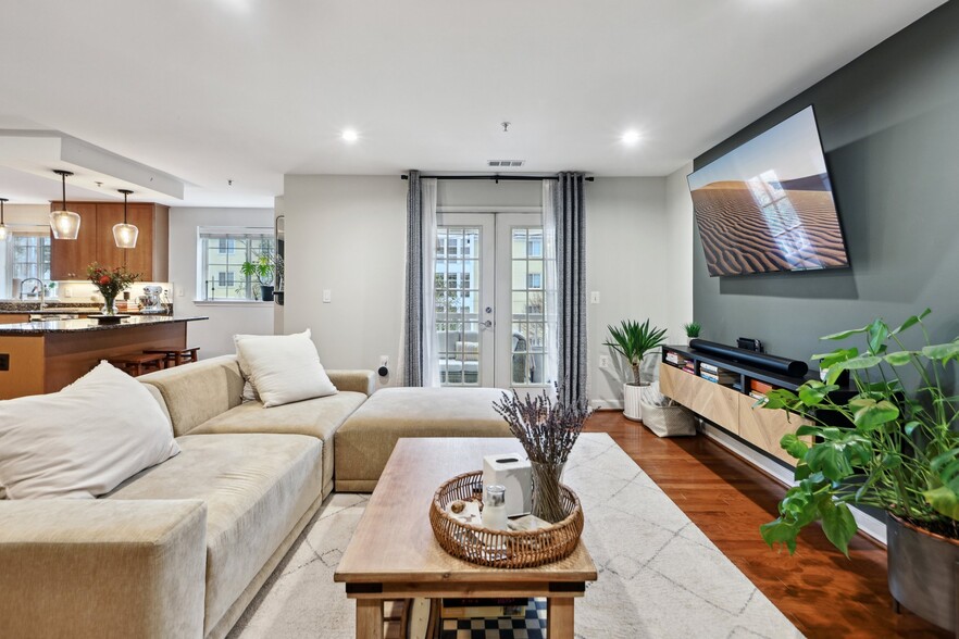 Smart home upgrades include keyless entry, voice-activated lighting throughout, a Nest thermostat, and more. The media cabinet conveys, allowing for a clean, wire-free TV setup. The unit also features a walk-in closet with built-in shelving and an LG Washtower with Steam Dry no more ironing.