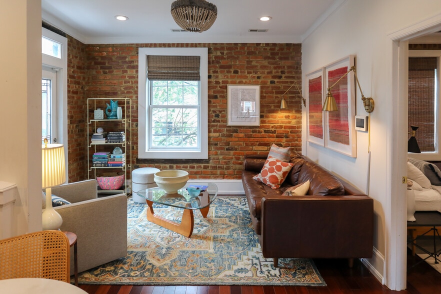 Charming second floor apartment near the Arts District situated above a tea room. Plenty of character with exposed brick walls, high ceilings and lots of natural light. Newly remodeled with a large kitchen featuring quartz counters, gas range and stove, dishwasher, disposal and stainless steel fridge, microwave and exhaust fan. Full-Size Washer and Dryer situated in the ensuite bathroom which is also newly renovated with tile floors, new vanity with plenty of storage and open shelving. Unit opens up to a spacious second story private deck. Unit has dedicate free parking located directly adjacent to the building. Small dogs allowed.