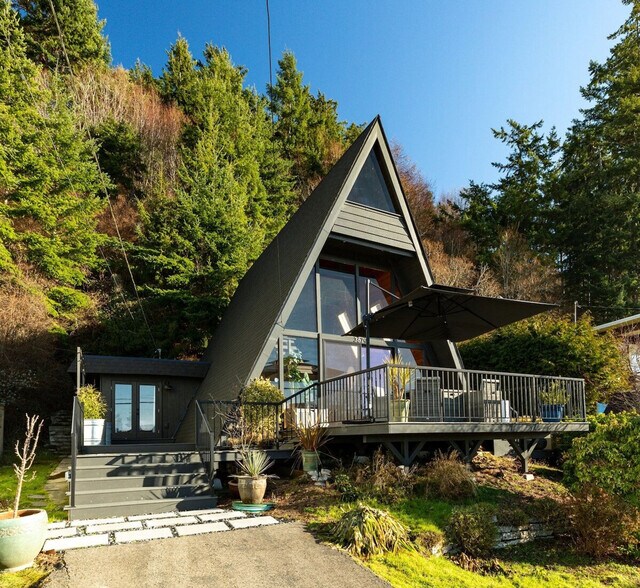 Feel at home in this beautifully designed and furnished A-frame getaway, minutes away from Meerkerk Garden and the beach. This three-level home offers 1,413 sqft of living space. Enjoy stunning sunsets and Olympic Mountain views on the oversized deck, complete with a dining set. The side yard features lounge chairs around a fire pit. The kitchen is stocked with high-end kitchen appliances, cookware, silverware, servingware, spices, coffee, and tea. All beds are outfitted with high-quality mattresses, linens, and a comfortable duvet. Big windows provide lots of natural light and breathtaking views of the ocean and the Olympic Mountains. An on-site washer and dryer are available for your laundry needs. The patio features comfortable outdoor furniture for an al fresco experience. Automatic shades and AC are available for the summer heat. There are two driveways that can accommodate one car each. A NEMA 14-50 level 2 and NEMA 5-15 level 1 outlet for EV charging are available; you would need to bring your own charger. Located on Whidbey Island, a tranquil retreat with lush forests, quaint towns, and stunning beaches, this home is ideal for nature lovers, with ample hiking, kayaking, and scenic views. Greenbank is in South Whidbey, a quiet, rural community and home to the 522-acre Whidbey Island Greenbank Farm. Two public beach accesses from Salmon Street are just a block away. The best way to explore Whidbey Island is by car. This is not a pet-friendly home; a $500 fine will be assessed for unauthorized pets. Strictly no parties and events are allowed, and quiet hours are between 10 pm and 8 am. No smoking or vaping of any kind is allowed anywhere on the property, including outdoor areas, and no digital piracy or shoes are allowed in the home; a $500 fine will be assessed per violation. Access to the open loft area with the two twin beds is via a spiral staircase, which may be unsafe for young children who are not proficient around stairs; however, there are two bedrooms on the lower floor that they can utilize. There are two dedicated workspaces in the house. One is a large desk against the dark gray wall on the lower level, and one is a small desk in the loft area on the second level. They each have a power strip, and the upper-level desk also has a 24" monitor that you can use. High-speed internet at 1Gbps is suitable for remote working and concurrent streaming. [SI]