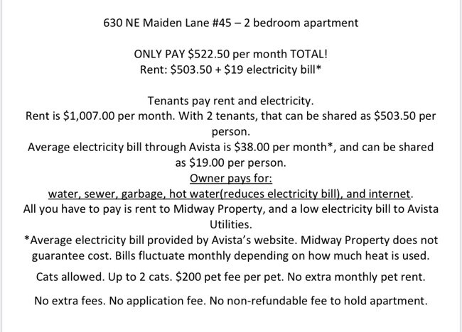 Enjoy one of our popular 2 bedroom units with a balcony at 630 NE Maiden Lane. Large closets--This unit comes with ample storage. Views of Reaney park and a short walk to campus. Right next door to Don's Midway Grocery so snacks and drinks are close by. Owner provides water, sewer, garbage, hot water, and internet. Tenant only pays for rent and electricity. We do have some off street covered parking available. Coin-operated laundry in the building. Lease term: June 15, 2020 - May 28, 2021. $1,007.00/mo or $503.50 per person. Security deposit $450 per person and due June 15, 2020. Due at lease signing is first and last month rent. June 2020 rent will be prorated. Cats allowed with a $200 pet fee per pet. Up two 2 cats allowed.