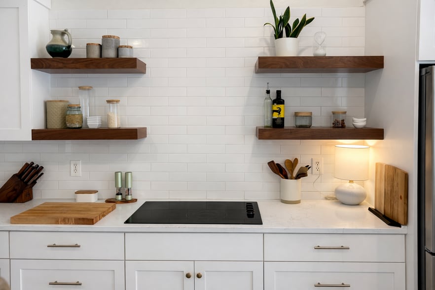 Modern Kitchen with quartz countertops and floating shelves, main bathroom, master bathroom, new roof, new windows/sliders, new exterior paint, large deck off of kitchen, private flagstone patio, tile foyer, fresh interior paint.