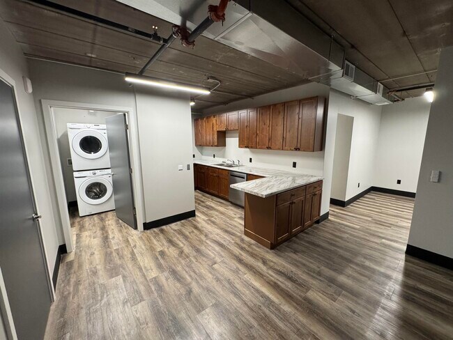 The Baehron Lofts, just minutes from vibrant Downtown Appleton. Step into an open-concept layout that seamlessly blends the kitchen, living area, and den—perfect for flexible use as a second bedroom, home office, or cozy retreat. The sleek industrial vibe shines through with exposed ducts, high ceilings, and durable wood-look flooring throughout. The contemporary kitchen boasts rich wood cabinetry, a marble-inspired countertop, a convenient peninsula for casual dining, stainless steel appliances, and ample storage. Enjoy the luxury of in-unit laundry with a stacked washer and dryer tucked neatly in its own closet. The spa-like bathroom featu