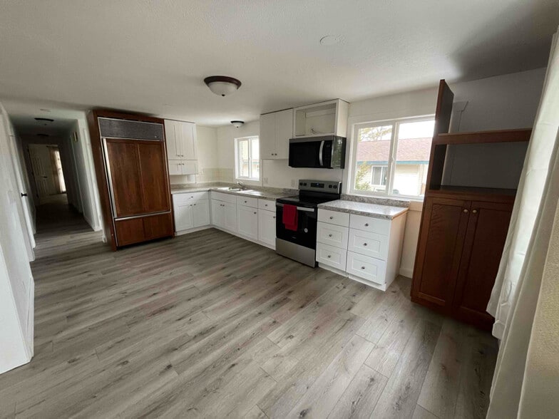 Spacious kitchen, living room, and outside patio