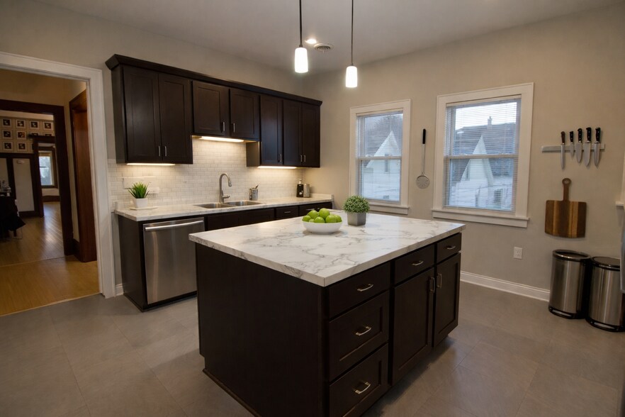 Step into refined living with this exquisite 2-bedroom, (+ office) luxury apartment, designed for those who appreciate style, space, and sophistication. Every detail has been carefully curated to deliver a premium lifestyle experience. Modern gourmet kitchen with high end stainless appliances, large island, espresso cabinets with marble laminate counter tops, ultra high ceilings, beautiful hardwood floors and a nice open layout. The entire flat has been remodeled from top to bottom which also includes a new furnace, new A/C unit, new kitchen, refinished floors, some new windows & painting throughout. This is an upper unit which also includes a finished attic for ample storage and walk-in closet space. Close to downtown Milwaukee, North Ave. the Lakefront and so many local attractions. A front deck and 1 Off-Street parking spot is included in the package. Excellent references and good credit is a must. Great local landlords manage and own this property.